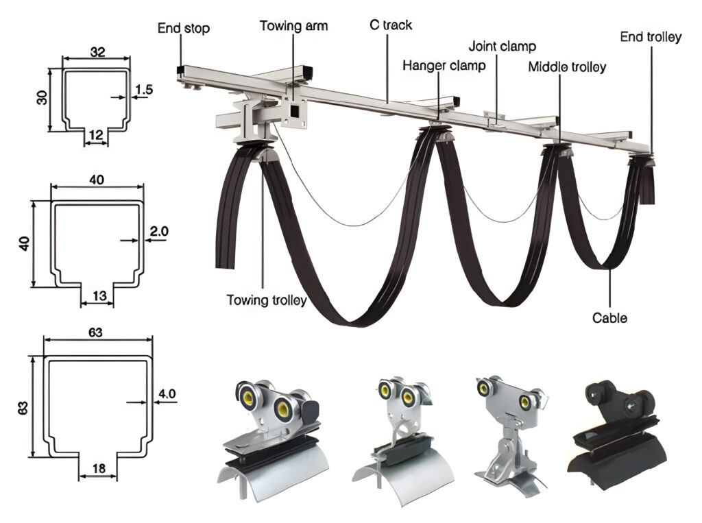 - Smooth Travel – Trolleys glide along a track, ensuring tangle-free and sag-free cable movement.